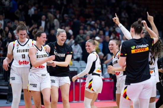 ↑3月12日,比利时队球员赛后庆祝胜利。当日,在武汉举行的2026年女篮世界杯资格赛A组比赛中,中国队65:80不敌比利时队。新华社记者伍志尊摄