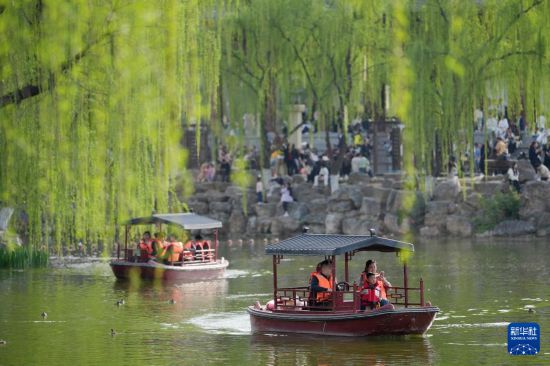 3月28日,游人在西安市兴庆宫公园泛舟赏春。