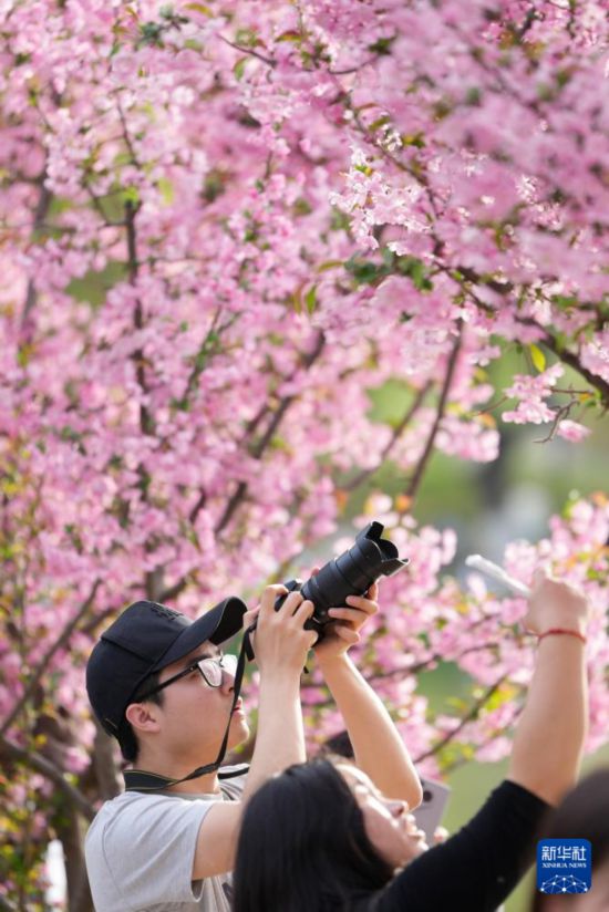 3月28日,游人在西安市兴庆宫公园拍摄垂丝海棠。