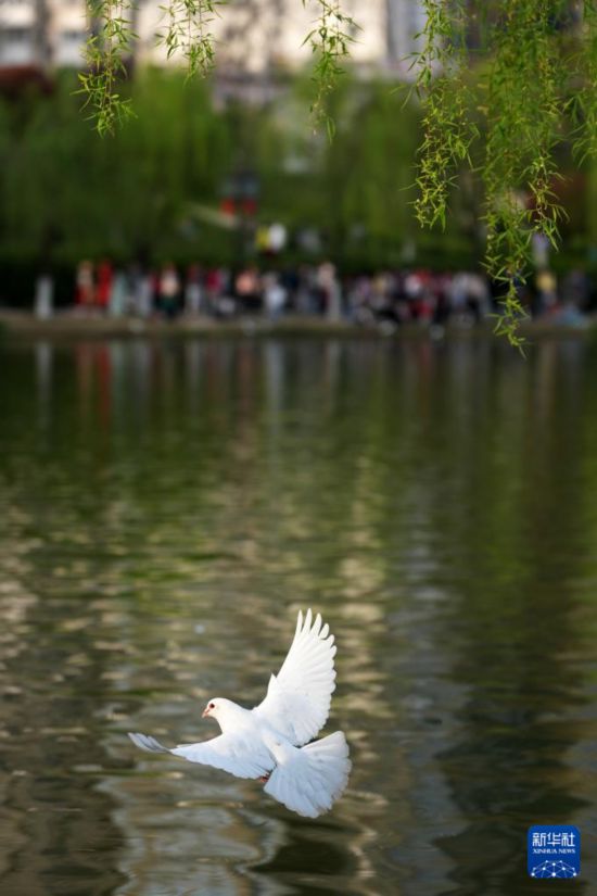 3月28日,一只白鸽在西安市兴庆宫公园的垂柳下飞过。