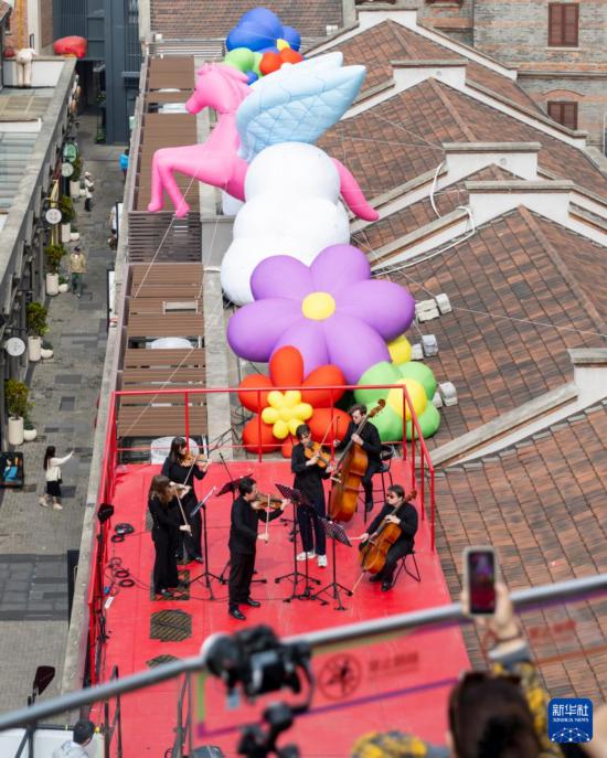 4月4日,第41届“上海之春”文艺轻骑兵惠民行虹口专场首场演出在“滨港商业中心今潮8弄”启幕。俄罗斯莫斯科国立柴可夫斯基音乐学院独奏家室内乐团来到百年弄堂屋顶演奏,为市民呈现沉浸式艺术盛宴。
