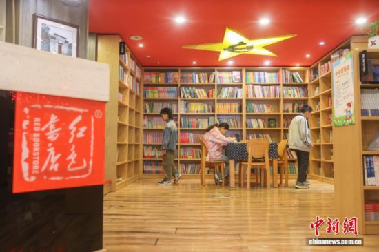 4月18日,几位读者在江西井冈山“红色书店”内看书和找书。井冈山“红色书店”于2015年开业,是中国首家以红色文化为主题的书店。 刘力鑫 摄